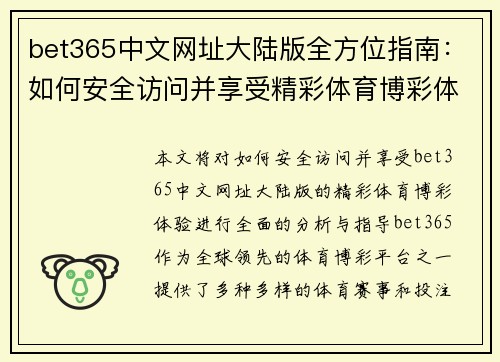 本文将对如何安全访问并享受bet365中文网址大陆版的精彩体育博彩体验进行全面的分析与指导。bet365作为全球领先的体育博彩平台之一,提供了多种多样的体育赛事和投注选项,但由于其在中国大陆的访问限制,用户在访问时可能遇到一些困难。本文将从四个方面为大家详细讲解:如何安全访问bet365中文网址,如何注册并保护个人信息,如何使用平台的各种投注功能,以及如何确保自己在享受博彩乐趣的同时,遵守当地法律和规定。此外,我们还会提供一些实用的技巧,帮助大家最大化自己的博彩体验。通过这篇指南,用户不仅能了解如何突破访问限制,还能学会如何更好地享受这项娱乐活动。