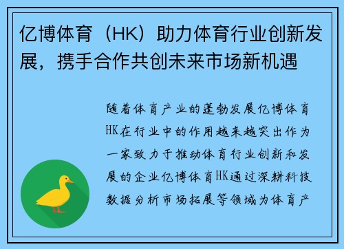 随着体育产业的蓬勃发展,亿博体育(HK)在行业中的作用越来越突出。作为一家致力于推动体育行业创新和发展的企业,亿博体育(HK)通过深耕科技、数据分析、市场拓展等领域,为体育产业的数字化转型和智能化发展提供了强有力的支持。在这一过程中,亿博体育(HK)不仅通过创新技术为体育行业带来革命性的变革,也通过与各方合作,推动了未来市场新机遇的共同创造。本文将从四个方面探讨亿博体育(HK)如何助力体育行业创新发展,携手合作共创未来市场新机遇。